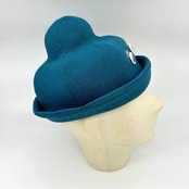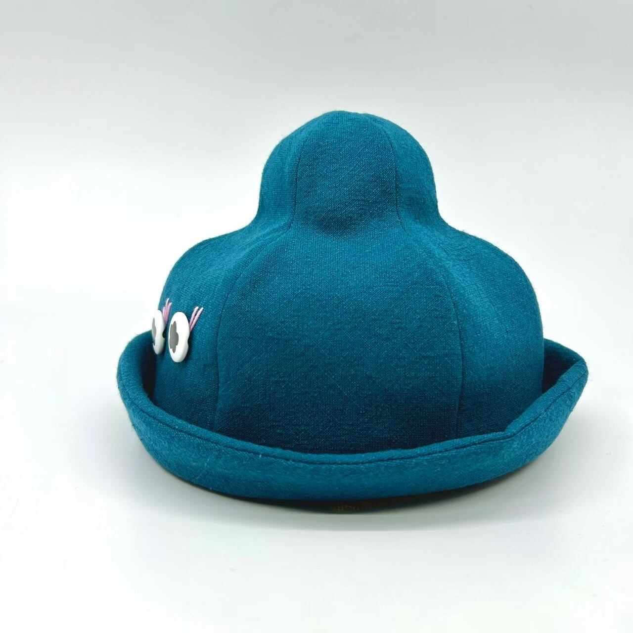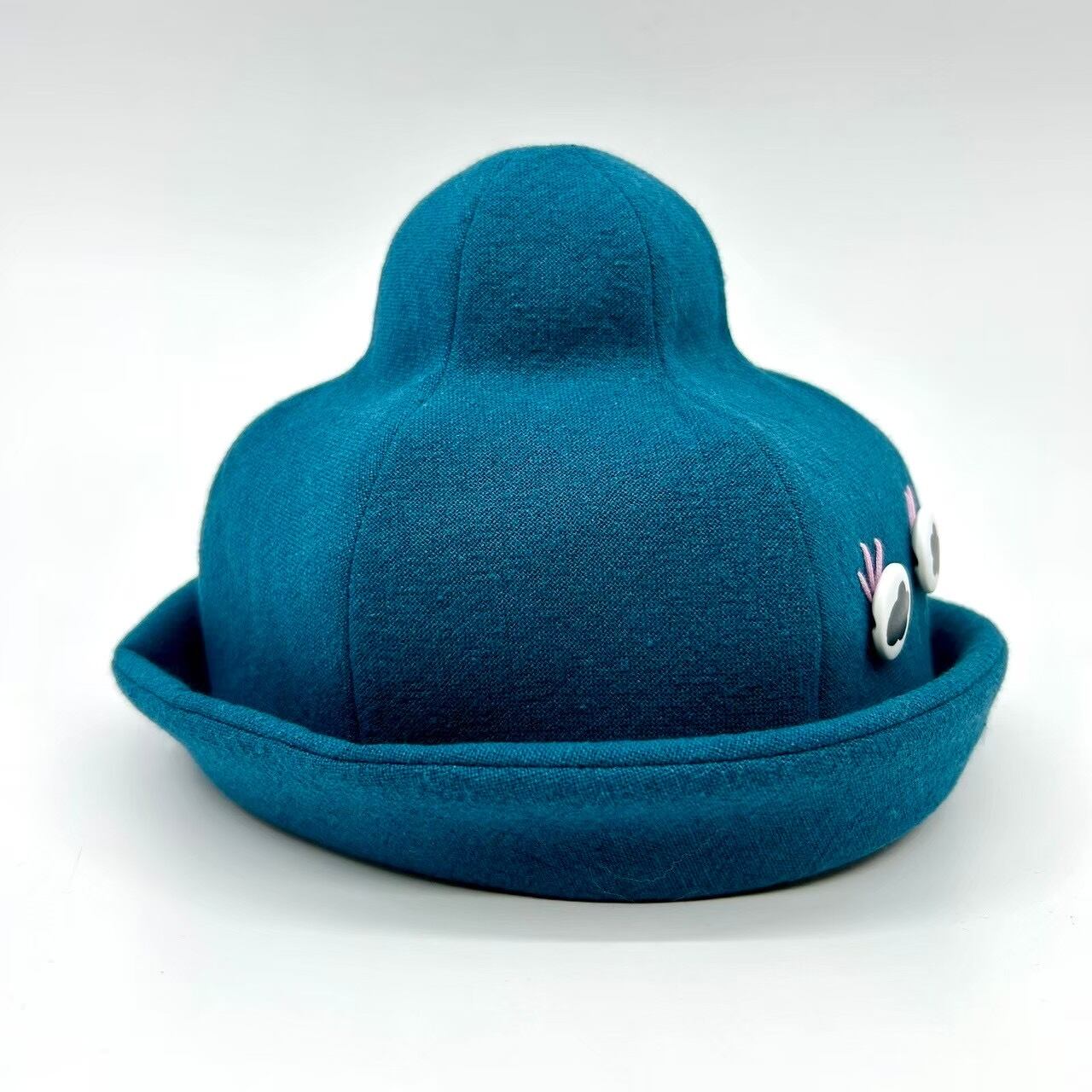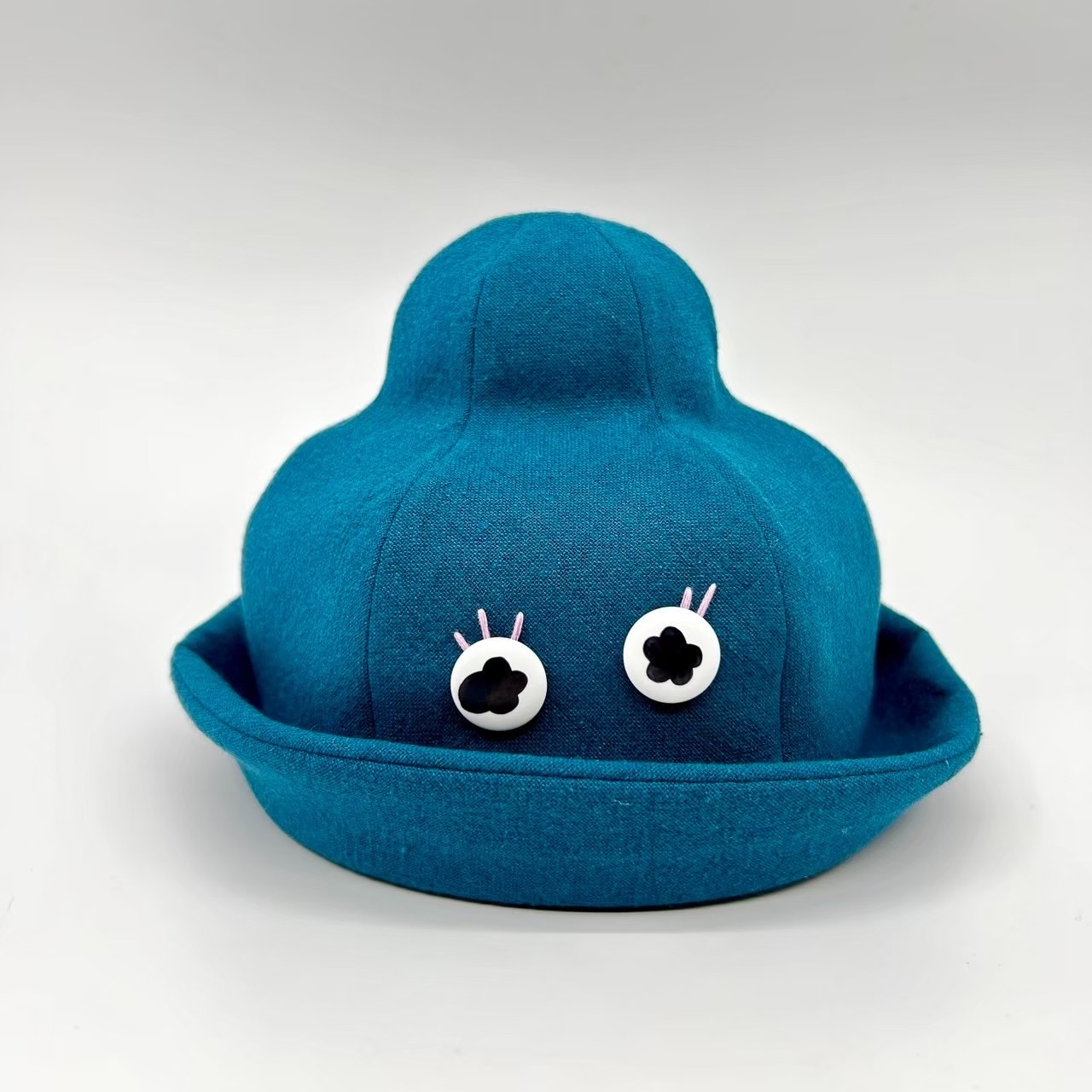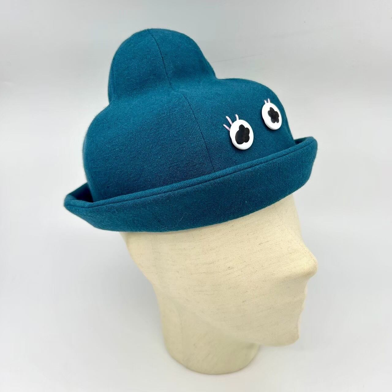 頭の上に小さな頭が乗った様な、なんとも言えない不思議なシルエットに仕上げました。愛嬌のある目玉のボタンを付け、まつげは手刺繍致しました。ひとつひとつが手作業の為、目玉は十人十色になっております。