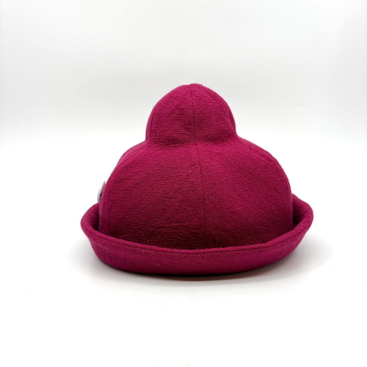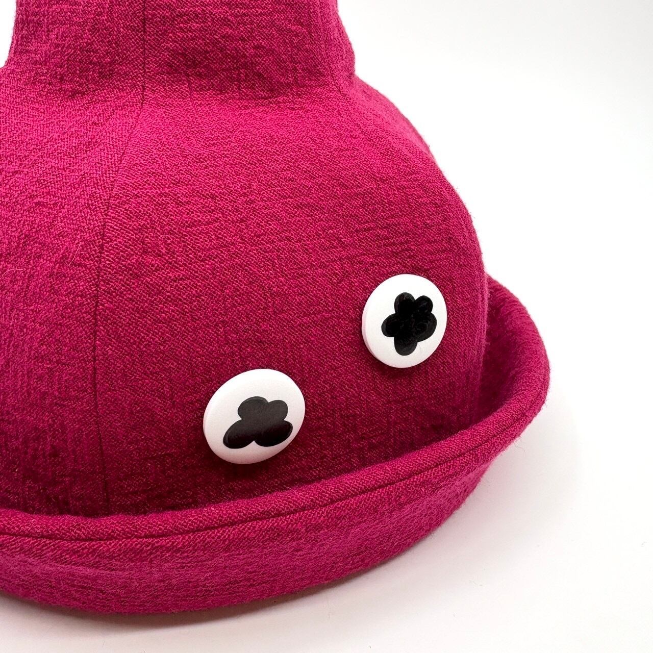頭の上に小さな頭が乗った様な、なんとも言えない不思議なシルエットに仕上げました。愛嬌のある目玉のボタンを付け、まつげは手刺繍致しました。ひとつひとつが手作業の為、目玉は十人十色になっております。